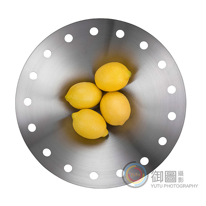 這個産(chǎn)品放在一個距離地面大概二十厘米的高度,三盞燈大概80厘米的高度,燈光分(fēn)别在産(chǎn)品左右兩側和上方的位置,機位在正上方垂直于産(chǎn)品,所幸的是,這是個拉絲金屬果盤,而不是鏡面金屬果盤,果盤内沒有(yǒu)出現亂七八糟的倒影,隻是在每個檸檬的周圍輕微地暈開一片淡黃色的影子。